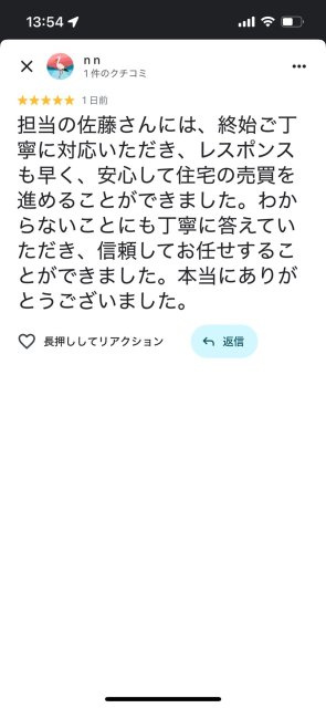 担当の佐藤さんには、終始ご丁寧に対応いただき、レスポンスも早く、安心して住宅の売買を進めることができました。わからないことにも丁寧に答えていただき、信頼してお任せすることができました。本当にありがとうございました。