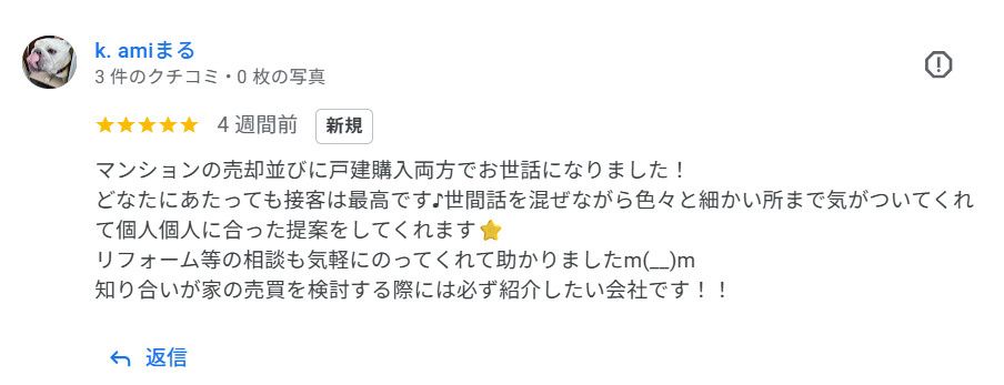 マンションの売却並びに戸建購入両方でお世話になりました! どなたにあたっても接客は最高です♪世間話を混ぜながら色々と細かい所まで気がついてくれて個人個人に合った提案をしてくれます⭐ リフォーム等の相談も気軽にのってくれて助かりましたm(__)m 知り合いが家の売買を検討する際には必ず紹介したい会社です!!